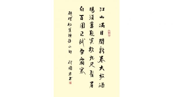 “江山满目开新卷,大放酒肠须盏干,莫欺九尺须眉白,百围已试雪霜寒。”叶圣陶80岁时,佛教领袖兼书法家赵朴初集陈后山句为他祝寿。前人诗句一经转化,竟贴切捕捉到叶圣陶神韵。前面两句说眼前的江山开启新篇章,是时候放开心情,拿起酒杯,一饮而尽。后面两句表达叶圣陶眉毛和唇髭皆白的面貌特征。“九尺”指身材,纯是艺术夸张,不是叶圣陶的实际身高。“莫欺”指别瞧不起,虽然白透须眉,却像需百人合抱的大树一般,早就有和寒冷霜雪较量经验。