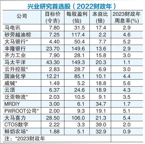 来到下半年,分析员认为,股市仍将保持紧张和波动性升高,下半年可以重点关注的,有银行、种植、油气、电讯、消费(包括电子制造服务EMS)和科技。原因是,银行和电讯公司具有一定程度的定价权,可以对冲通胀;大宗商品行业应继续受益于价格上涨,因必需消费品的需求强劲。而科技股会保持积极的增长前景,因其收入以美元计算。