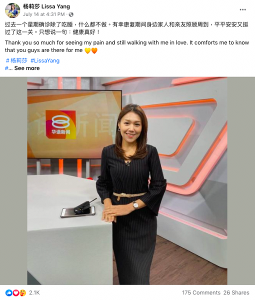 杨莉莎在三周前第一次确诊冠病,随后在本月14日在脸书专页发文表示已经康复,不料却在周日(24日)二度确诊,病情比之前严重。