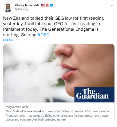 他在推特上分享纽西兰推行全面禁烟法令的新闻时说,纽西兰是在昨日提呈了其“迈向一代人彻底戒烟(GEG)”法令。