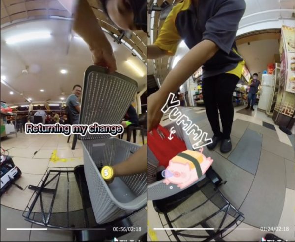 有员工问起:“钱叻?”,男子才指示他们到遥控车后面的灰色篮子查看,员工一打开便惊呼:“哇!里面有钱!”,员工接着取出现金,并将找零放回篮子里。