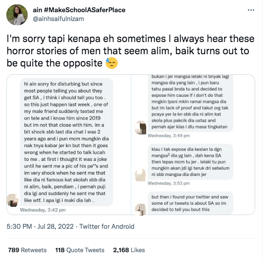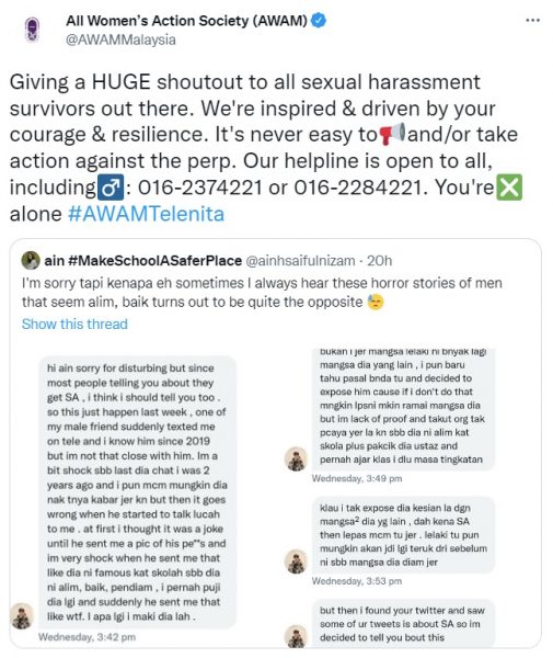 艾因公布了女同学的遭遇和苦恼后,贴文受到了网民的关注,妇女行动协会(AWAM)也转发有关帖文。
