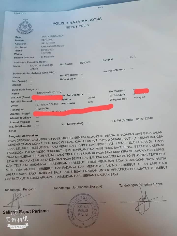 昨晚,脸书用户Danny Chan在“浪浪分享群”脸书群组发澄清帖,并附上自己的报案纸,还有与狗狗的合照。