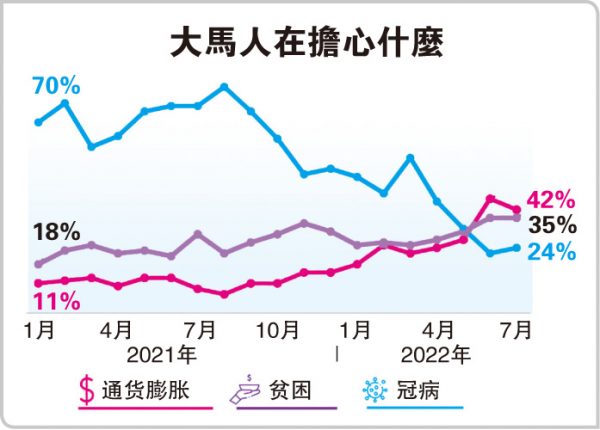(八打灵再也8日讯)国际市场咨询公司益普索(Ipsos)最新发布的一项调查结果显示,随着冠病疫情的缓解,通货膨胀和贫困问题已取代民众对冠病的关注,成为大马人的最大担忧。