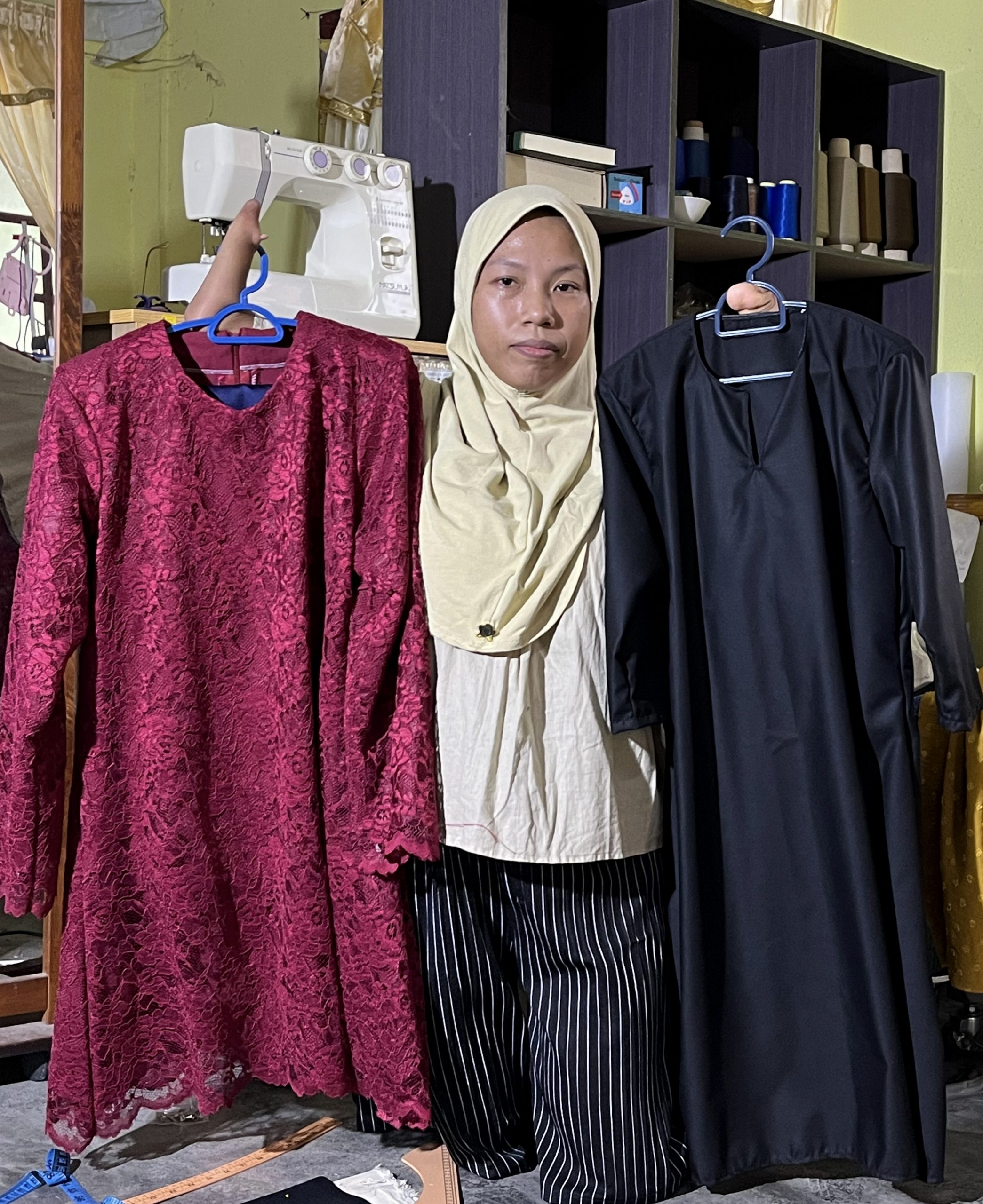 “我平均每个月可以接获10至20个订单,在大节日时将增加50个订单,我已很满足。通过这些缝纫工具,我可以缝制男装和女服装,还有制作珠饰和头巾。”