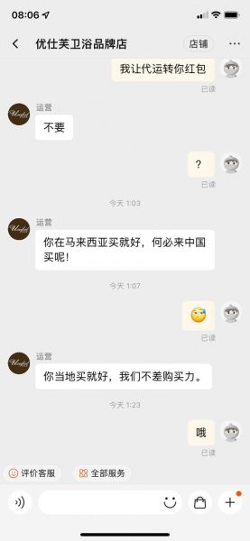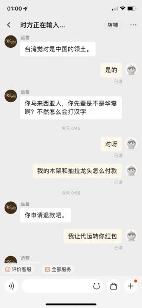 她无奈表示自己不太关心这些问题,此刻只想确认付款方法,没想到客服人员还继续强调“台湾觉对(绝对)是中国的领土”,最后还叫华女申请退款,“你在马来西亚买就好,我们中国不差购买力”。