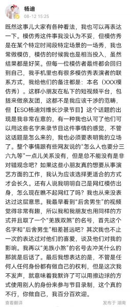 杨迪表示自己参加的是选音乐女主播的节目,ESO是其中一位女主播请来的亲友团,他有要求节目组剪掉ESO的片段,并表示他不会主张这种风气,“我很珍惜我的羽毛,也认为硬实力才应该是推崇和有价值的。要对被伤害到的朋友说一声抱歉,以后我和我的团队也一定更加敏锐,下不为例。”随后,刘维也转发了杨迪的微博,并配文致歉,表示自己是训练生出身,更明白靠实力让大家认可的不易。