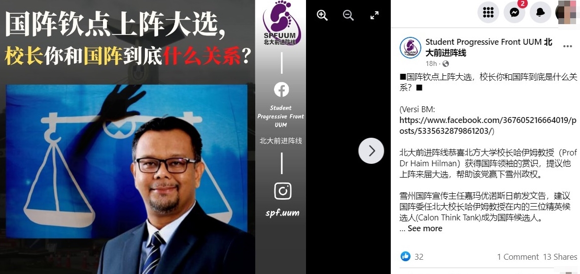 北大前进阵线昨日在脸书贴文,指哈音希尔曼应对这项建议表态,如果有意在国阵旗帜下竞选,那么应该立即辞去北大校长职,为北大师生留下一个独立自主及自由中立的空间,避免北大学术自由被政党议程给绑架,沦为替政客服务的工具。