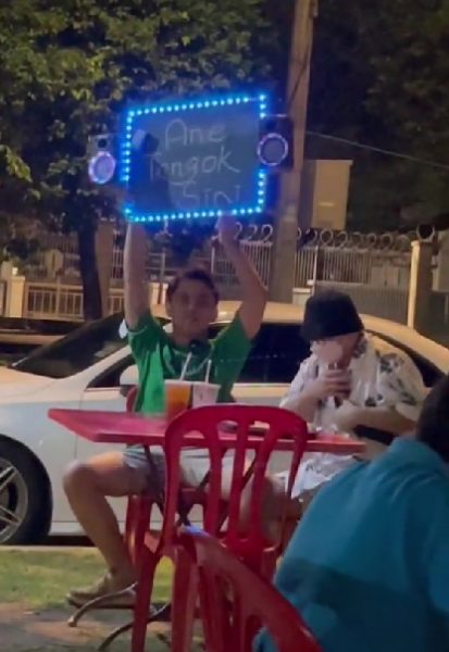 在仅13秒长的视频中,可见两名男子坐在户外的一张桌子,其中没有戴口罩的男子举起写着“Ane tengok sini”(兄弟看这里)的黑板。
