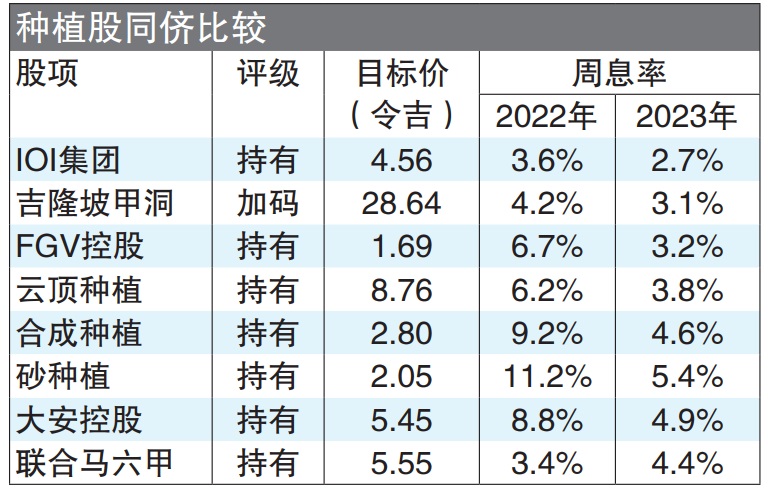 分析员认为,种植业近期缺乏催化剂,主要是下半年原棕油价格走低,但还好2022年种植股2022年受4.7%周息率扶持,维持种植业“中和”评级。