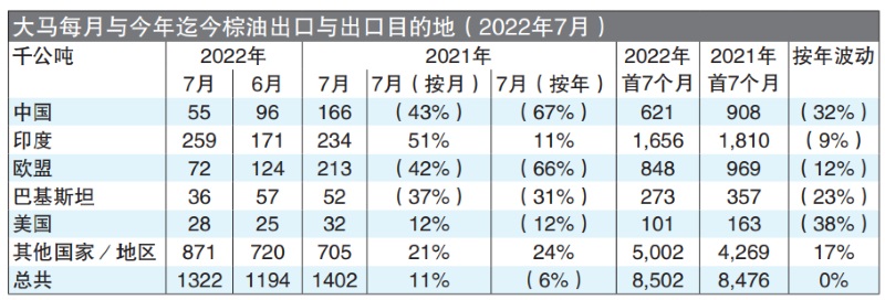 7月大马棕油出口按月增11%、按年跌6%至130万公吨,印尼业者延缓出口(预期8月可能削减出口税)一些时候,促成大马棕油出口增长。