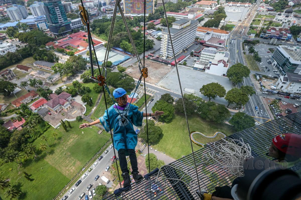 (亚罗士打14日讯)马来西亚国际伊斯兰大学(UIAM)女大学生穿着毕业袍在亚罗士打电讯塔上体验惊险刺激的极限降落运动(Dropzone),并在高空中拍下特别的毕业照,引起全场瞩目。