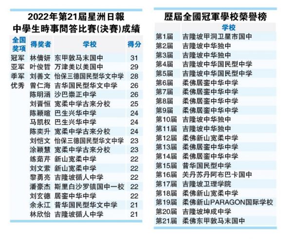 (八打灵再也15日讯)“2022年第21届星洲日报中学生时事问答比赛”决赛成绩揭晓,来自柔佛东甲敦马末国中的林倩妍,以得31分的优势,荣获全国冠军,而敦马末国中也同时获得“冠军学校”荣誉。