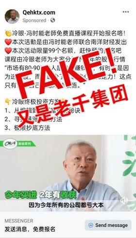 原名冯时能的冷眼于今午召开新闻发布会时指出,他于去年起,就接到亲友询问指是否在脸书等社交媒体开班传授股票投资的课程,甚至还以能在7至10天内,通过美股和港股赚取暴利等噱头招生。