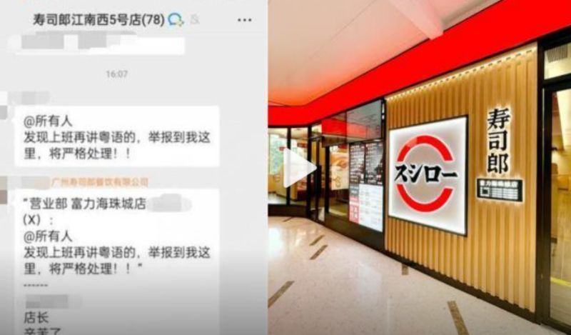 日本跨国连锁寿司店寿司郎在中国广州一家分店早前在公司工作群组留言,禁止员工上班时说粤语,只能以普通话沟通,“发现上班讲粤语的,举报到我这里,将严格处理”,又指“特别是讲粤语的几个人,再有类似情况发生,直接辞职回家”。