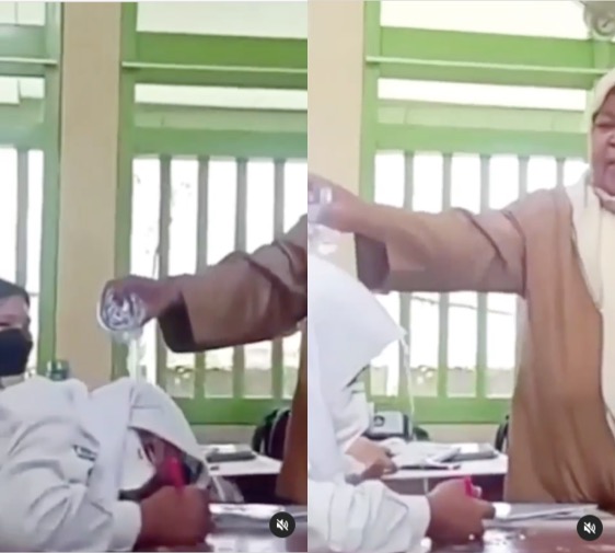 据了解,事件是发生在印尼东加里曼丹的某所中学。视频可见女同学趴在桌子上睡觉,女教师见状直接走到学生的座位前,往学生的头浇水,女同学马上惊醒。