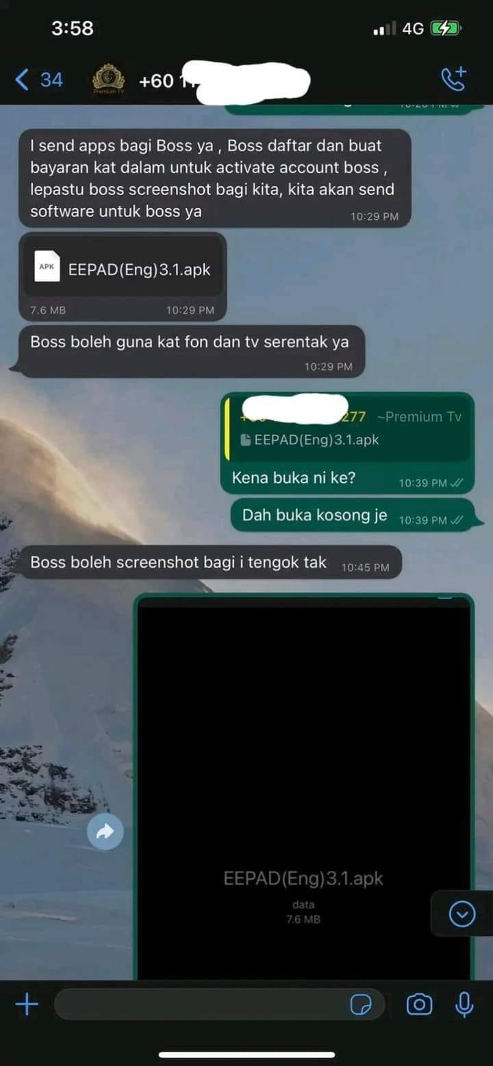老千在WhatsApp传了一个不明的APK给女子,让她安装。(取自脸书)
