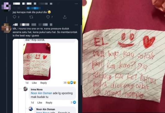这名网民说,受害者的母亲没有上传女儿手写的一张纸条照片,该纸条的内容是女孩控诉被自己的父母虐待。