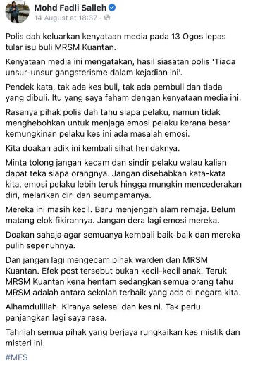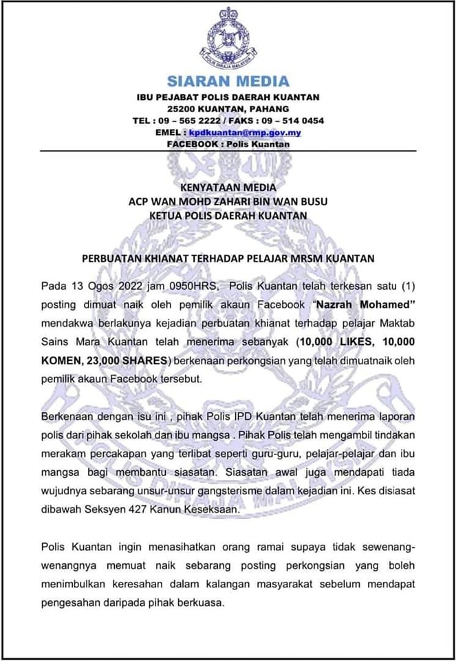 一名在脸书有多达56万追随者的网红老师莫哈末法德里,日前也在脸书撰文表达自己对此事的看法时,上传了关丹警方对此事的声明。