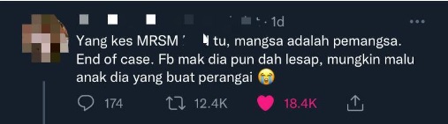 这名网民还说,受害者母亲关闭自己的脸书帐号,可能对女儿的行为感到羞耻。