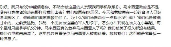 (八打灵再也23日讯)“政府是不是没有打算像台湾越南那样救我们出去?我们被困在KK园区……百多位马来西亚人被虐待着。救救我们!这可能是我最后一封信息了。”