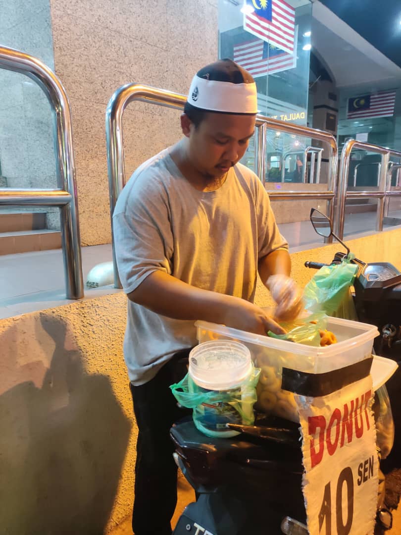 此外,他也于每逢周三下午2时30分开始,在妻子陪伴下一起到龙运瓜拉阿邦的甘榜巴鲁售卖甜甜圈。