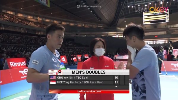 在19平时,许永凯重重杀球,御宇的被动回防致后场出界,新加坡组合先以20比19拿到赛点。随后耀新连续杀球得分一度追至20平,但骆建贤杀球再得分,新加坡组合再度以21比20领先,这时许永凯发球开高球骗到了王耀新,新加坡组合拿下胜利。