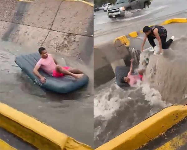 Captan a joven en un colchón inflable sobre el Canal #GomezMorin en #Delicias Chihuahua después de la intensa lluvia que azotó a la Ciudad y dejó inundaciones repentinas.