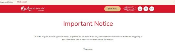 云顶名胜世界官网于今晚发布文告指出,在8月30日下午1时30分,由于火警虚报事故,导致SkyCasino入口处的防火卷帘自动关闭。