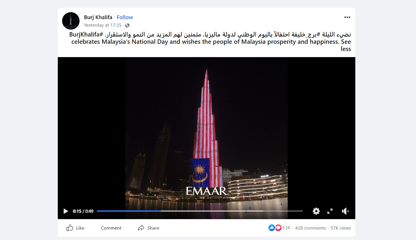 “#BurjKhalifa庆祝马来西亚国庆日,并祝愿马来西亚国泰民安。”