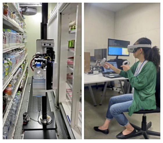 万一机器人出现判断失误,Telexistence的工作人员会戴VR头盔,远程操作机器人,让它恢复正常状态。