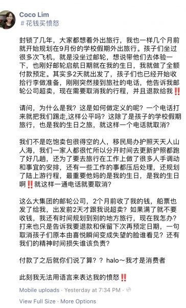 她在脸书撰文分享,云顶邮轮超卖导致她的生日旅游就此泡汤,心情也从喜悦瞬间变成失望。