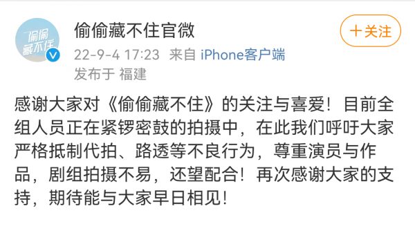 对此,官方微博打破沉默发声,“感谢大家对《偷偷藏不住》的关注与喜爱!目前全组人员正在紧锣密鼓的拍摄中,在此我们呼吁大家严格抵制代拍、路透等不良行为,尊重演员与作品,剧组拍摄不易,还望配合!再次感谢大家的支持,期待能与大家早日相见!”