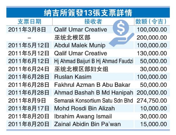 这些支票的接收者包括了巫统北根区部以及巫统北根区部妇女组,涉及数额分别为20万和3万令吉。