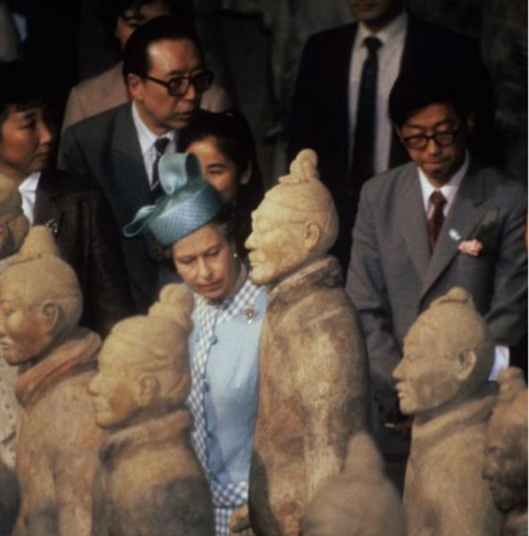 据英国高级皇家记者伊尔斯报道,伊丽莎白二世1986年成为第一位访问中国的英国君主,她在1986年10月对中国进行了为期6天的正式访问。女王和菲立普亲王在这次历史性的访问期间,到访了北京、上海、西安、昆明、广州等城市;参观了长城、西安秦兵马俑博物馆、紫禁城等。