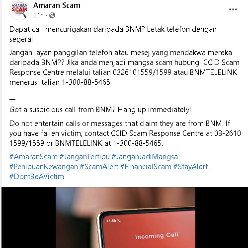 国家银行的“Amaran Scam”脸书专页提醒民众,不要应酬任何自称是国行的电话及讯息。