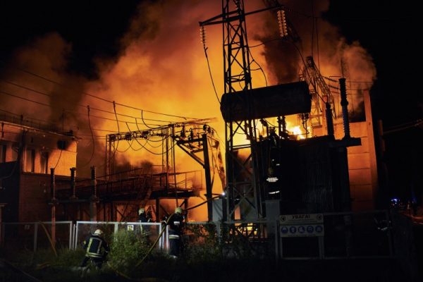 俄罗斯发射的火箭星期日晚击中乌克兰哈尔科夫的一座发电站,乌克兰国家紧急服务中心的消防员正在全力扑火。(美联社照片)
