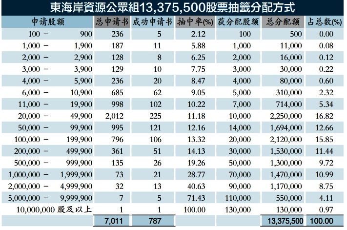 当中,供土著认购部份接获4758份申请,认购3亿零958万3500股,等同超额认购22.15倍;而供公众认购则接获3189份申请,认购3亿7192万6600股新股,超额认购达26.81倍。