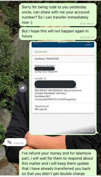 根据她贴出与送货员的对话截图,“请赔偿蛋糕98令吉、送货费15令吉,总共113令吉。”;送货员则回应说:“蛋糕是便宜的,而且我日薪才50至60令吉,现在口袋也只剩60令吉。”