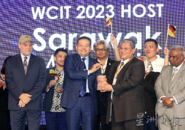 今日下午,砂拉越数字经济机构主席丹斯里阿玛莫哈末莫希迪在闭幕仪式上,从今届大会主席谢溢高手中接过“2023年第27届世界资讯科技大会”主办权。
