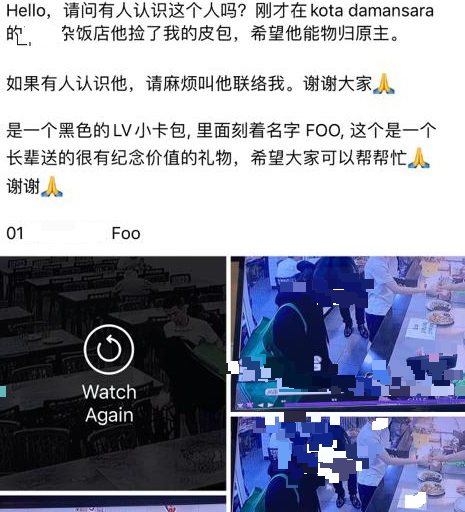 男子在贴文中指出,他是在星期一(12日)晚上8时30分发现卡包丢失,于是返回位于哥打白沙罗的一家餐馆寻找,并在业者的协助下查看闭路电视,发现有2名男子拿走了他的卡包。