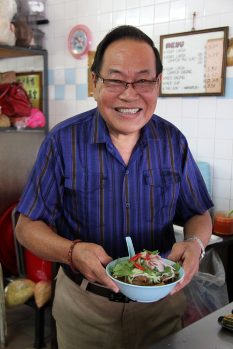 耀哥说,十八岁那一年开始,他便在金宝戏院街的新光五金店任职,一做就是十八年。后期由于母亲患上老人病,需要请人照料,于是下班后便到五金店旁的为食街(Jalan Market)摆摊卖面以增加收入,而五金店老板的大媳妇黄桂莲女士(为了感激,耀哥要求我一定要写出名字)也热心教他如何烹调亚参叻沙与排骨面,但那时候他只是当作part time,做做停停;直到母亲病情严重,他才辞去收入不多的五金店工作,想要全职找个固定档口以多赚些钱来医治母亲,无奈开张前三天母亲就往生了。