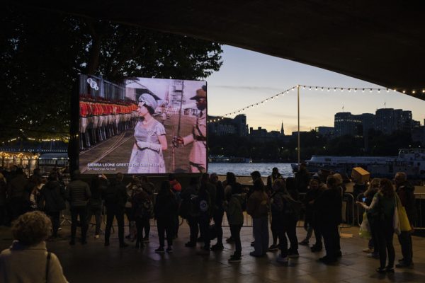 英国空军飞机随后将女王灵柩载往伦敦。数以万计民众在大雨中夹道列队迎灵,国王查尔斯三世与王室成员在白金汉宫迎接女王灵柩。在御林军阅兵式和王室成员陪伴下,女王灵柩从白金汉宫移灵西敏厅,并在这里停灵数日供大众瞻仰、追思。排队等向女王灵柩致意的人潮绵延4公里,队伍最前端的民众更是在外守候48小时。