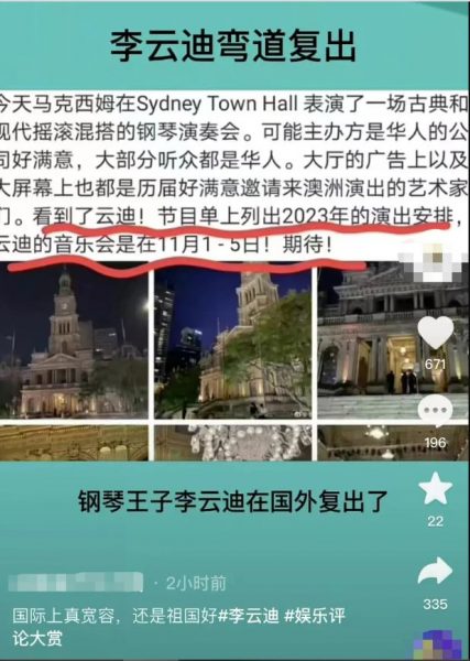 (悉尼∕北京20日综合电)中国“钢琴王子”李云迪于2021年爆出嫖娼风波,被北京朝阳公安分局依法行政拘留,随即消失在荧光幕前惨遭封杀,至今行踪成谜。不过网上近来疯传一位来自澳洲网民的消息,表示在看克罗地亚钢琴家马克西姆的演出时,发现了2023年的演出节目单上有李云迪的名字,时间在11月1至5日,该网民还直言十分期待。