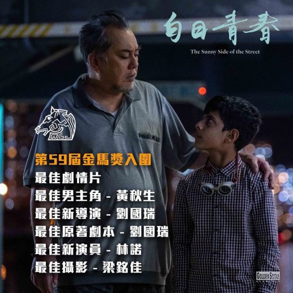 另外,在香港发展的马来西亚导演刘国瑞,则凭《白日青春》入围最佳剧情片、最佳新导演、最佳男主角(黄秋生)、最佳新演员(林诺)等6奖。刘国瑞来自麻坡,2008年赴港读大学,已居留14年。《白日青春》是他在香港拍的第一部剧情长片,讲述一个香港德士司机协助难民男孩偷渡的公路逃亡之旅。他之前受访时曾表示,“马来西亚有个花踪文学奖,标语是‘海水到处有华人,华人到处有花踪’;而身为福建人,这份情绪会更加浓重。因为我家长辈经常听福建歌,那些歌很喜欢以浪子心声为主题,在外飘流,为衣锦还乡而打拼。”