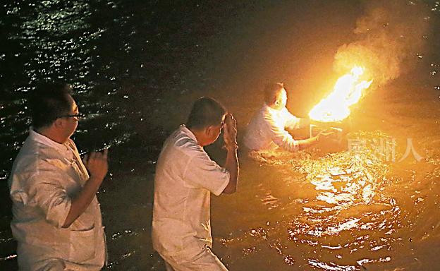 这天晚上,也是信徒恭送九皇爷回銮的日子。大队人潮同样簇拥载有神明香炉的圣轿,浩浩荡荡前往河边,再由道士主持送神仪式,被选出的执委则手捧着正在燃烧的香炉并登上木船,前往河中央送别九皇爷,象征神明正式离开。