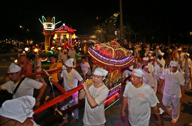 往年的初五还有全境巡安大游行,以林府太师领先,九皇大帝居中,田府元帅后,3座圣轿为巡安队伍,一路上有乩童演示神功,以各种形状的锐器、粗细铁枝、刀剑等穿刺脸颊、舌头和其他肉身部位,还有赤手把玩在炭火中淬炼到透红的铁链、铁球等,听起来,有点类似大宝森节的游行,看回旧照片,竟然还有乩童将脚踏车的把手穿刺脸颊,以脸撑着整辆脚踏车游行。