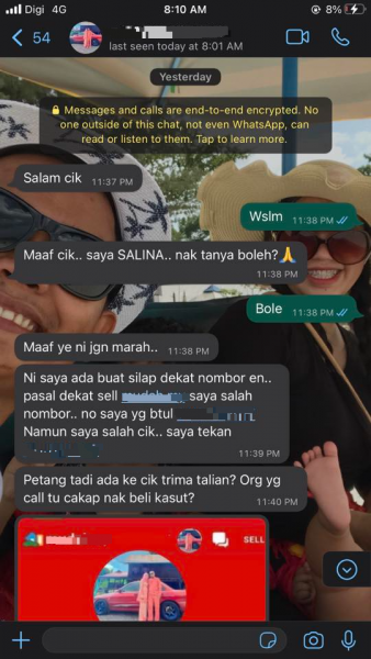 根据他所分享的对话记录截图,骗子声称她在网卖平台mudah.my开通了新的账号,但却不慎填成了法益鲁的电话号码。