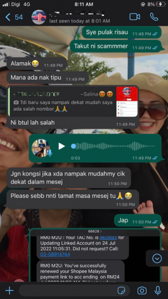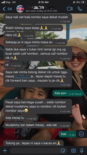 骗子说她想重新设置自己的电话号码,请求法益鲁将mudah.my的一次性密码(OTP)转送给她,“求你帮帮我,不然我很难做生意,我换了电话号码后就不会烦你了”。