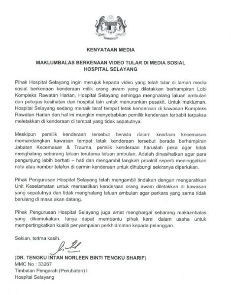 士拉央医院第一副主任(药品)东姑英丹诺丽以电邮回复星洲日报表示,在社交上疯传的这个视频指一辆公众的轿车停在日常治疗中心大楼大厅( Lobi kompleks Rawatan Harian )附近,从而阻碍了医院其他的救护车和医护人员放下病人的通行路段。